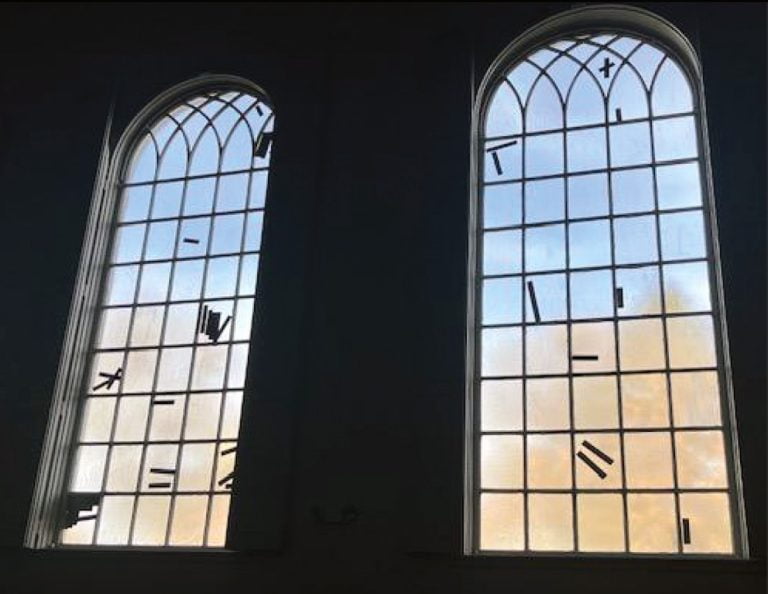 Telltale signs of a 2022 hail storm that caused significant damage across the community and campus remain visible on Hastings College’s iconic French Memorial Chapel: