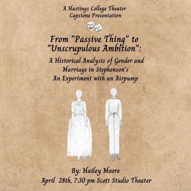 Hastings College theatre has announced an upcoming senior capstone presentation. Hailey Moore of Juniata, Nebraska, will present, “From ‘Passive Thing’ to ‘Unscrupulous Ambition’: A Historical