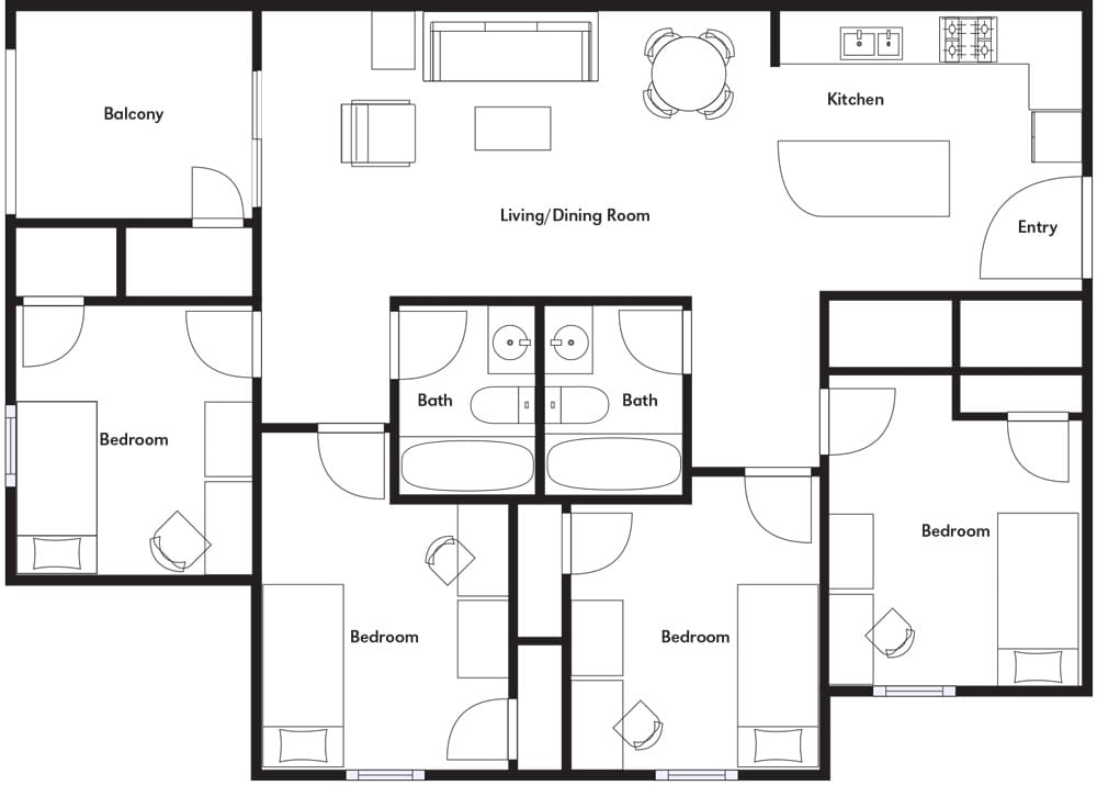 Each apartment features four bedrooms and two bathrooms, plus a kitchen, living area and deck or patio. Laundry is provided in each building.